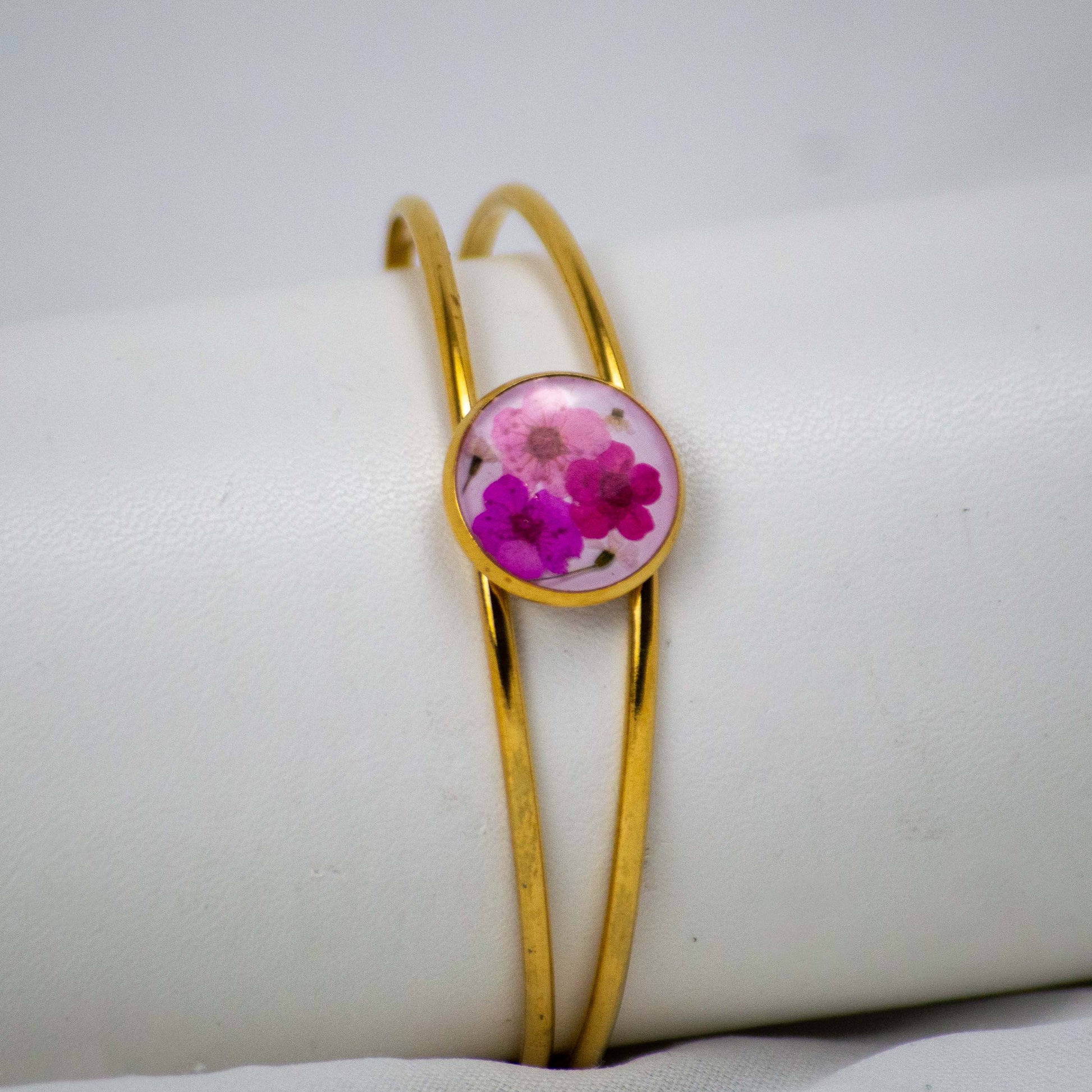 Diese Armspange enthält echte gepresste Spirea und Wilde Möhre, von Hand in eine runde Harzfassung eingebettet. Die Spange öffnet sich und lässt sich in der Weite anpassen. Weil jede Blüte einzeln platziert wird, sieht kein Stück aus wie das andere. Die weißen Blüten füllen die runde Fassung gleichmäßig und setzen einen zarten Akzent am Handgelenk.