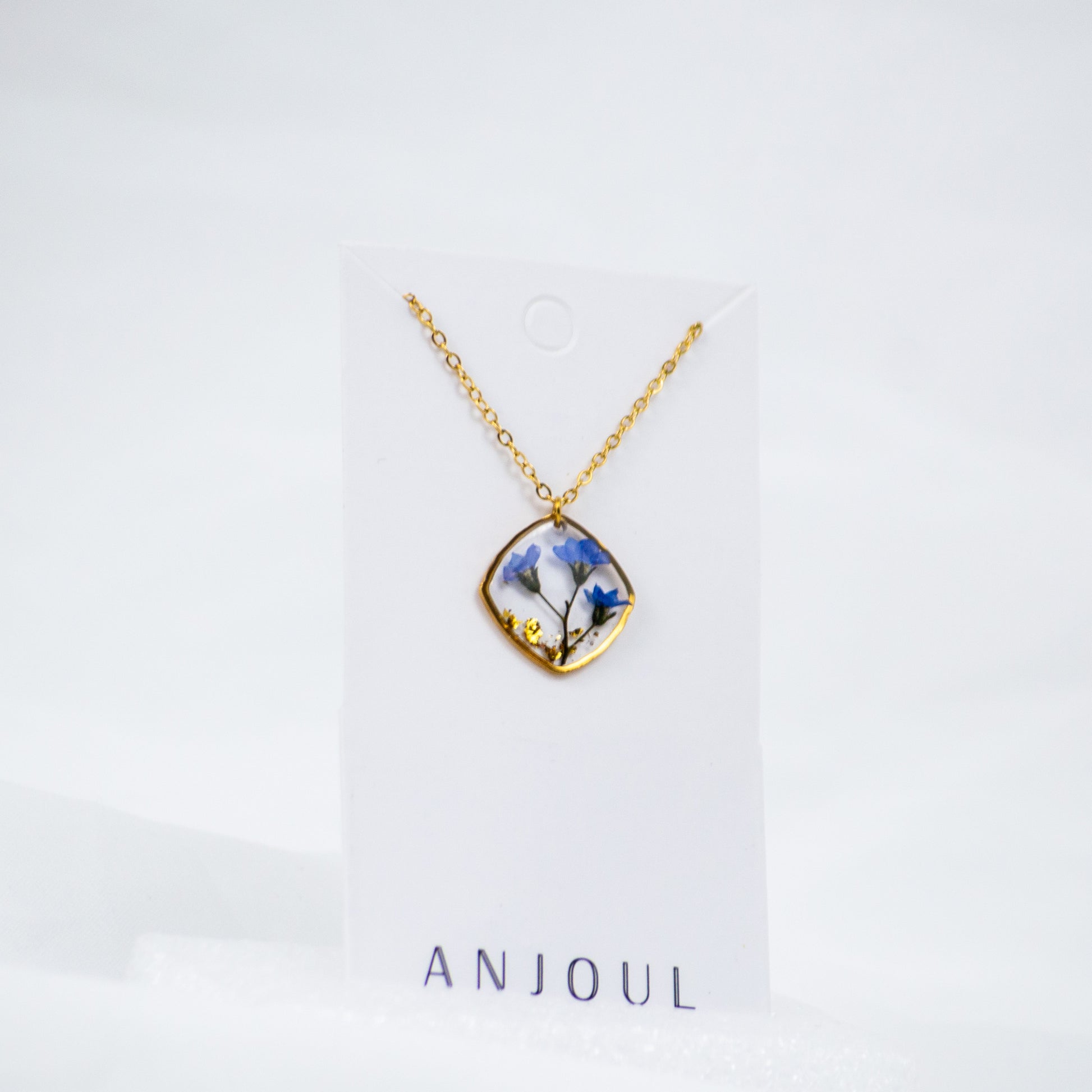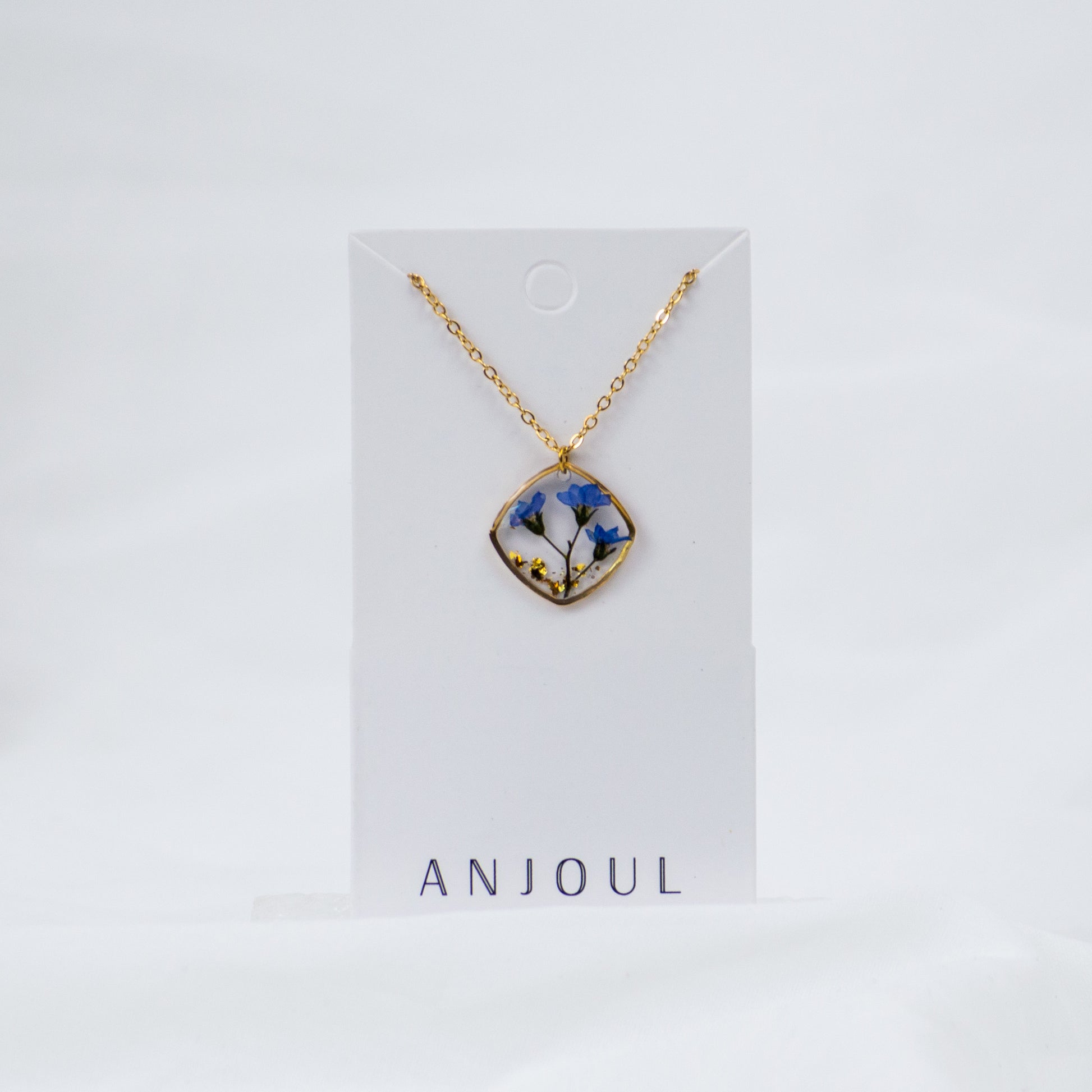 Ein echter Vergissmeinnicht, für immer festgehalten. Diese Halskette trägt eine einzelne echte Blüte in sich – eingebettet in klaren Gießharz, sichtbar aus jedem Winkel, unvergänglich in ihrer Form.